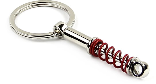 Wysokiej jakości metalowy brelok do kluczy w kształcie amortyzatora w kolorze czerwonym.
