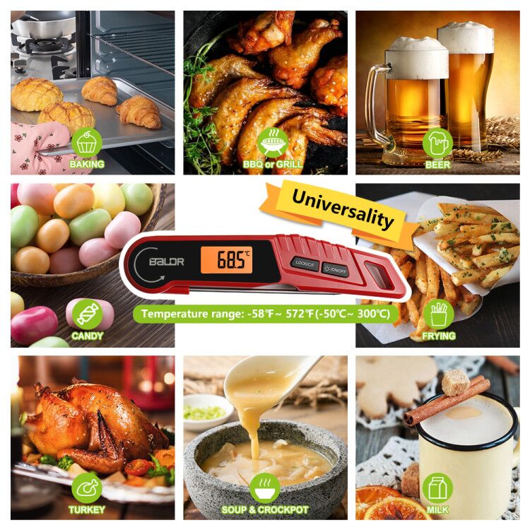 Termometr do żywności Baldr B371 posiada wielofunkcyjne zastosowanie, dzięki czemu będzie pomocne zarówno przy gotowaniu, smażeniu, grillowaniu, a także chcąc sprawdzić temperatury wody np. przy przyrządzaniu herbaty. Dzięki niemu poznasz dokładną temperaturę jedzenia w 2 sekundy.