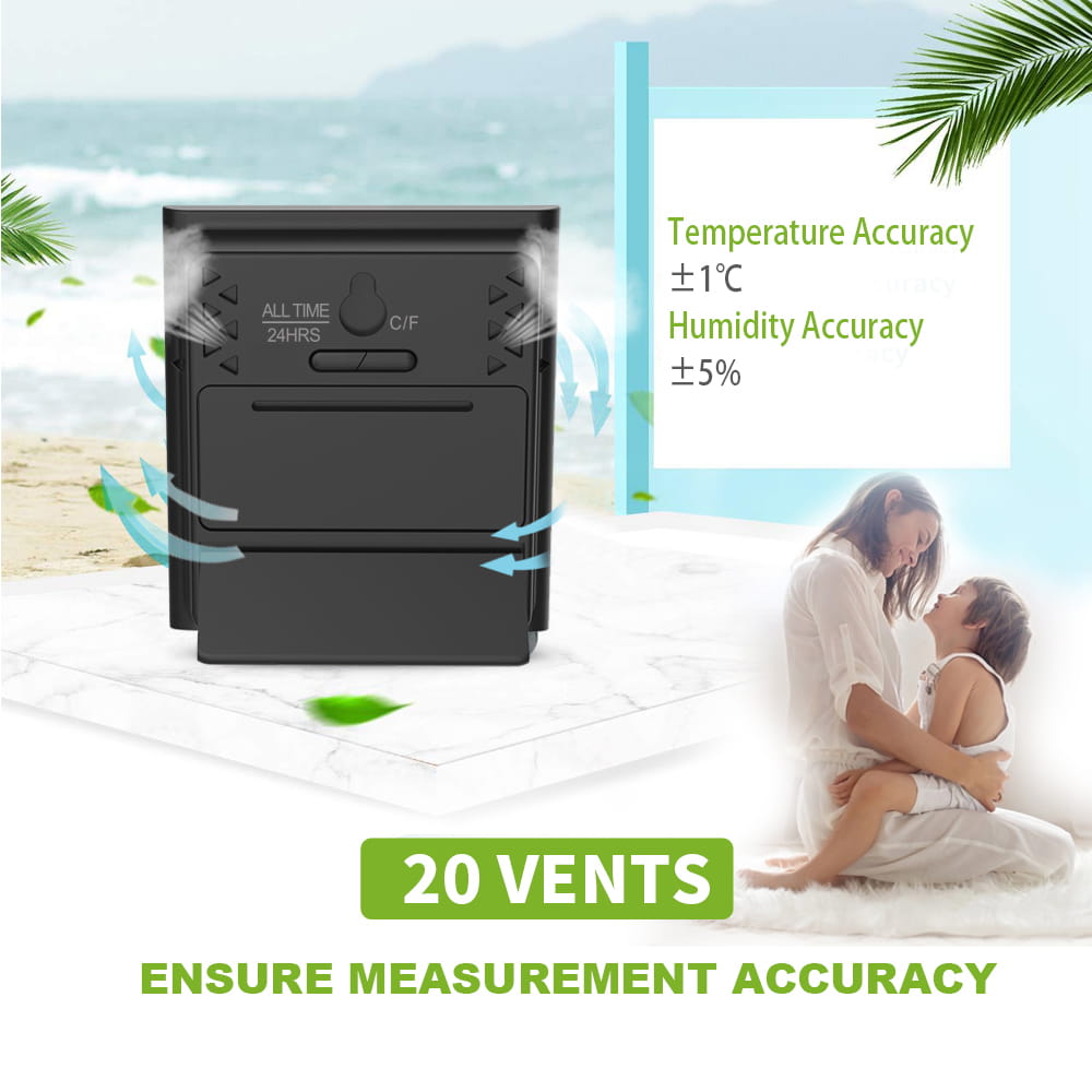 Wyświetlanie temperatury termometru waha się od 0°C do 50°C z odchyleniem ±1°C. Wilgotność jest wyświetlana w zakresie od 10 do 99% RH (±5%) i przedstawiana wizualnie za pomocą symbolu twarzy. Odczyty aktualizują się automatycznie co 10 sekund dzięki wbudowanym czułym czujnikom.