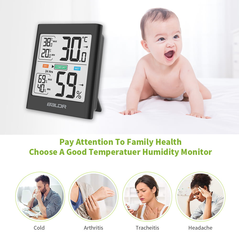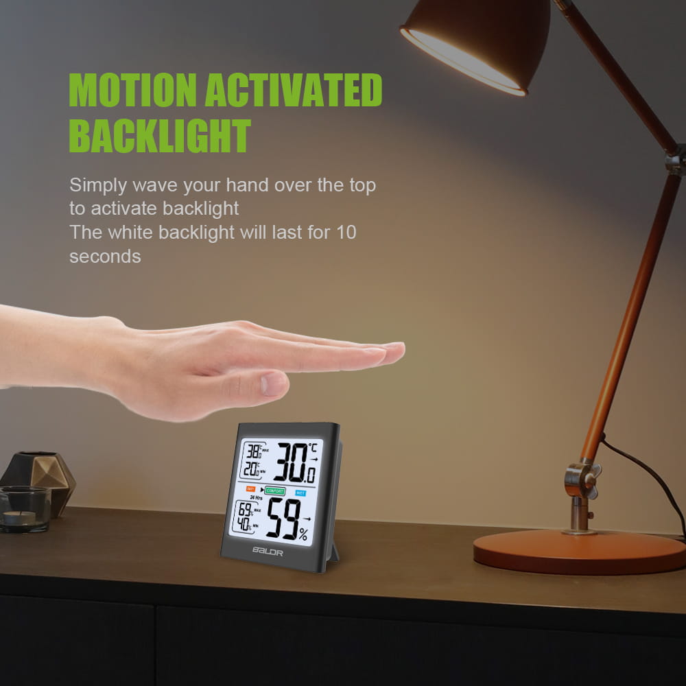 Inteligentny termohigrometr Baldr B135 do użytku domowego to niezwykle proste i funkcjonalne urządzenie, które pozwoli monitorować warunki w domu regulując je do optymalnych. Urządzenie wyposażono w 10-sekundowe białe podświetlenie, które można aktywować przez wbudowany czujnik ruchu.