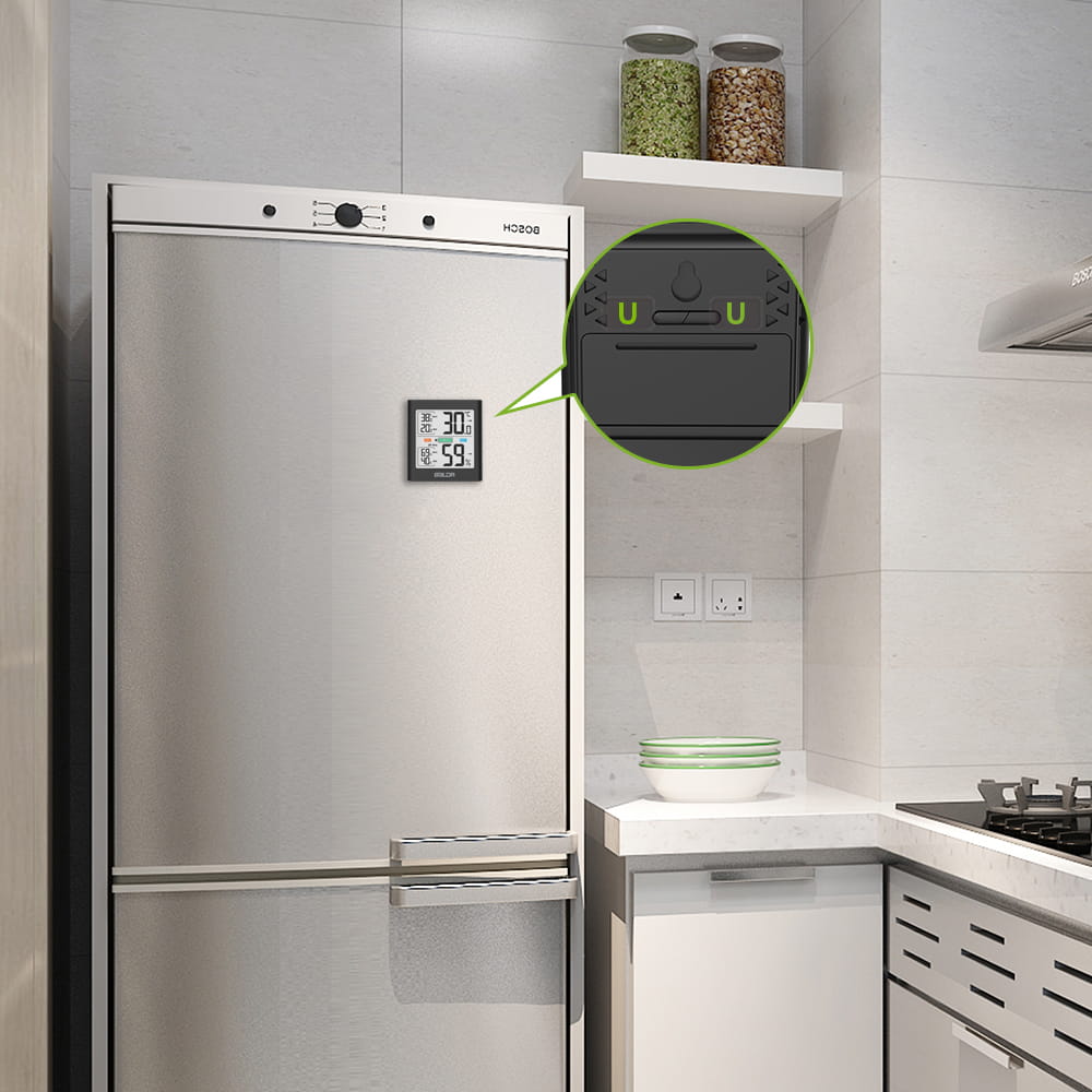Dzięki praktycznemu magnesowi z tyłu, stojakowi na stół i uchwyt do zawieszania, czujnik można łatwo zamontować/przymocować do wielu powierzchni w zależności od potrzeby.