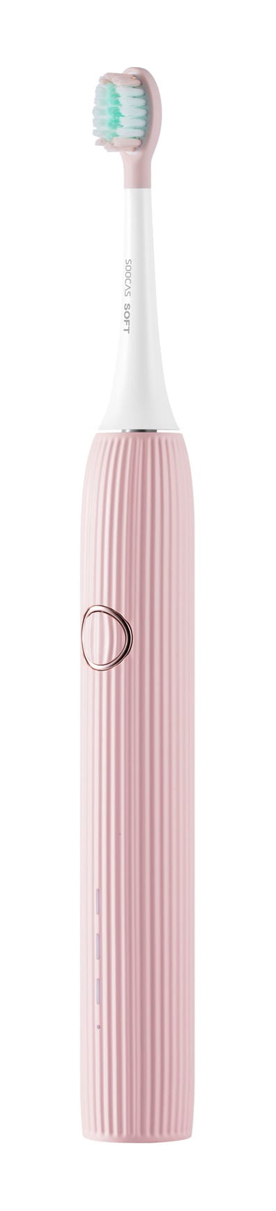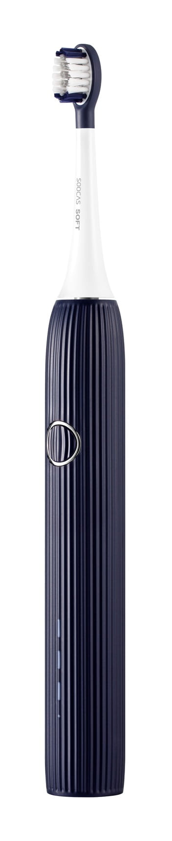Obudowa szczoteczki jest przyjemna w dotyku i zaprojektowana w taki sposób, by zapobiegać wypadaniu urządzenia z ręki. Zintegrowany z nią przycisk umożliwia wygodną zmianę trybów - wybór każdego z nich powoduje podświetlenie innej diody. Soocas V1 wyposażona została również w małą diodę, która świeci na czerwono, gdy poziom naładowania baterii jest już słaby, a na zielono, gdy urządzenie zostanie naładowane.