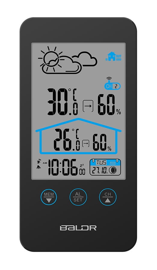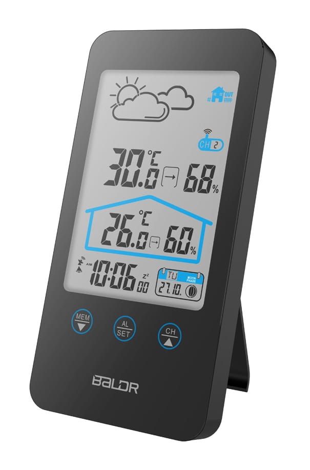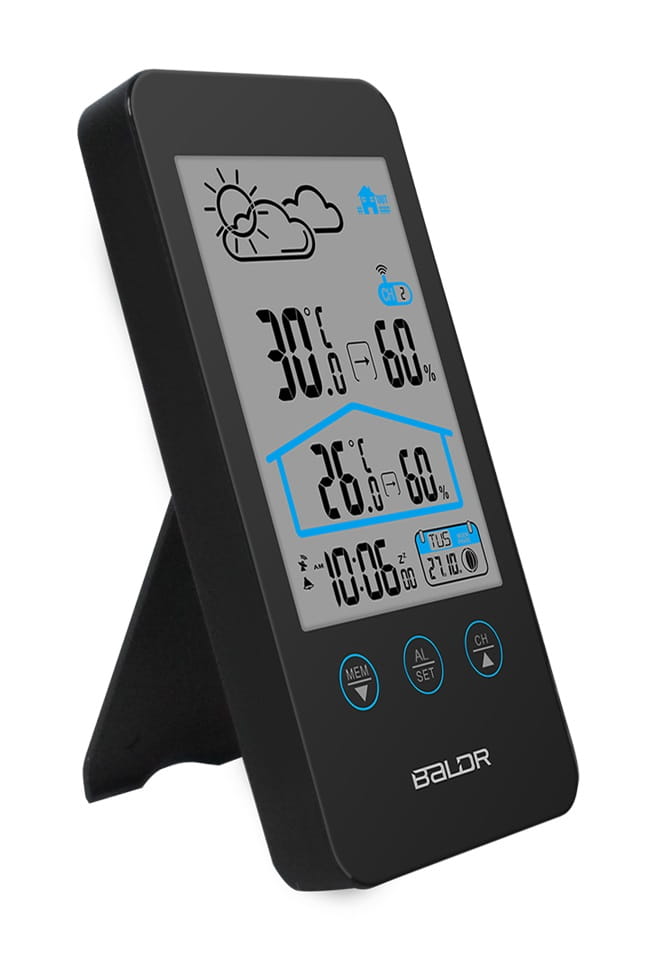 Stacja pogodowa Baldr B201 ma elegancki, czytelny dotykowy wyświetlacz z kompleksowymi danymi dotyczącymi temperatury, wilgotności i prognozy. Bezprzewodowy czujnik zdalny z mini wyświetlaczem dołączony do zestawy o zasięgu do 100 metrów pozwoli na wyświetlenie warunków w miejscu jego umieszczenia, np.: na podwórku, ale także w pokoju dziecka, piwniczce, czy magazynie. Model Baldr B201 pozwala na prognozę pogody na 12-24 godziny.
