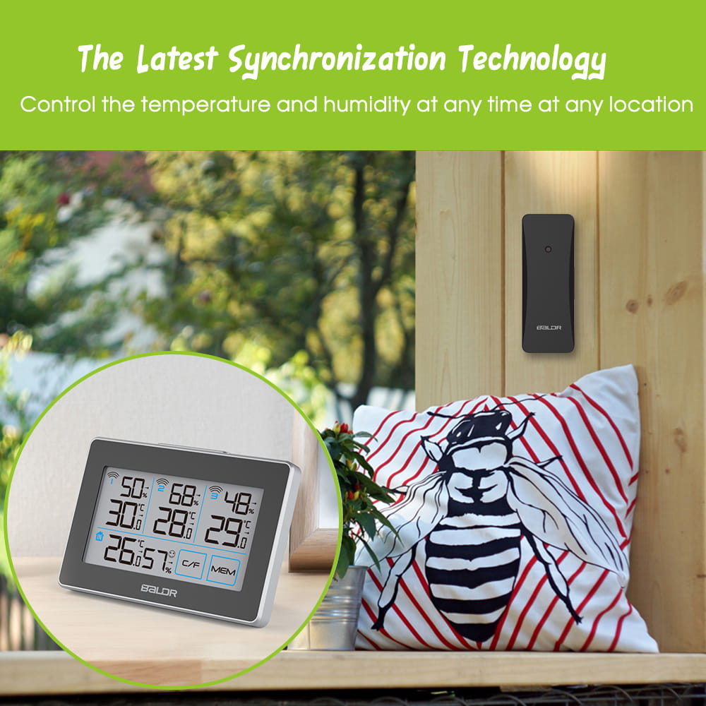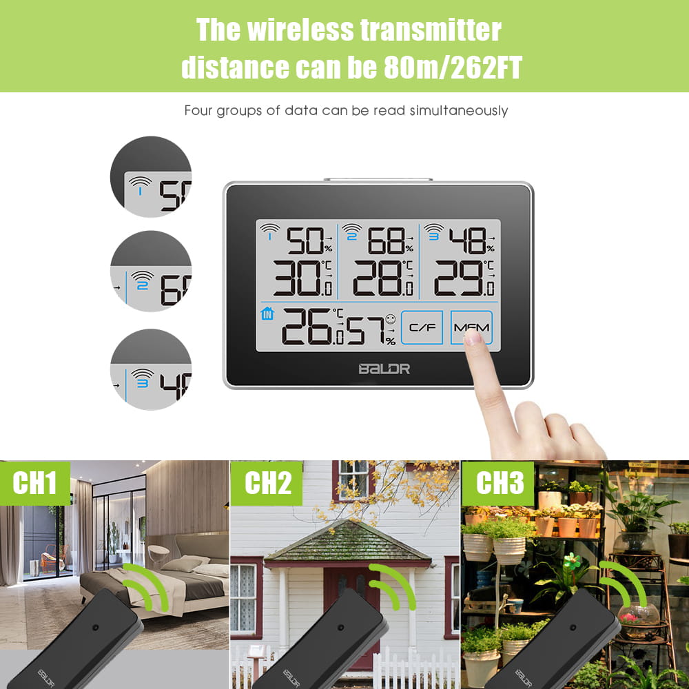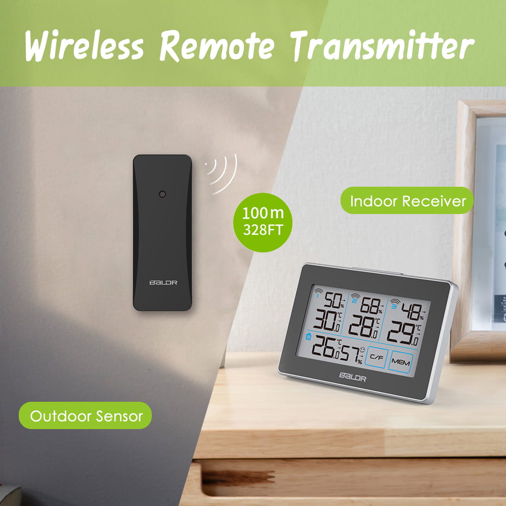 Bezprzewodowa stacja pogodowa Baldr B3174 z funkcją ekranu dotykowego z kompleksowymi danymi dotyczącymi temperatury, wilgotności wewnątrz i na zewnątrz. Bezprzewodowy czujnik zdalny dołączony do zestawy o zasięgu do 80 metrów pozwoli na wyświetlenie warunków w miejscu jego umieszczenia, np.: pokoju dziecka, na zewnątrz, piwniczce, czy magazynie.