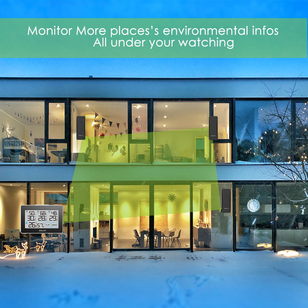Zdalny czujnik temperatury i wilgotności na zewnątrz pozwala na aktualizacje pogody w deszczu lub śniegu do 80m. Czujnik zewnętrzny może monitorować temperaturę zewnętrzną w zakresie od -20°C do 60°C, zasilany bateriami 2x AA (brak w zestawie).