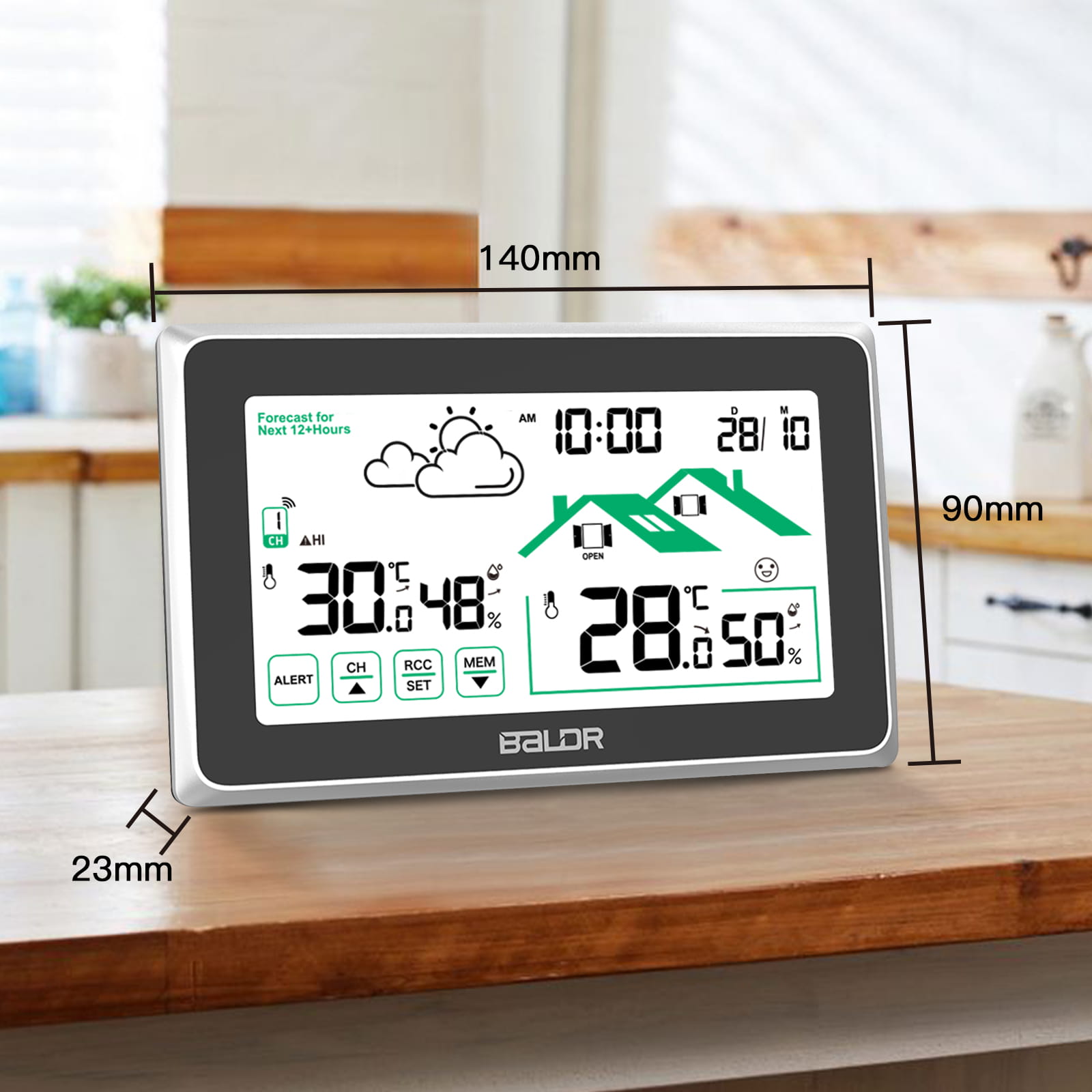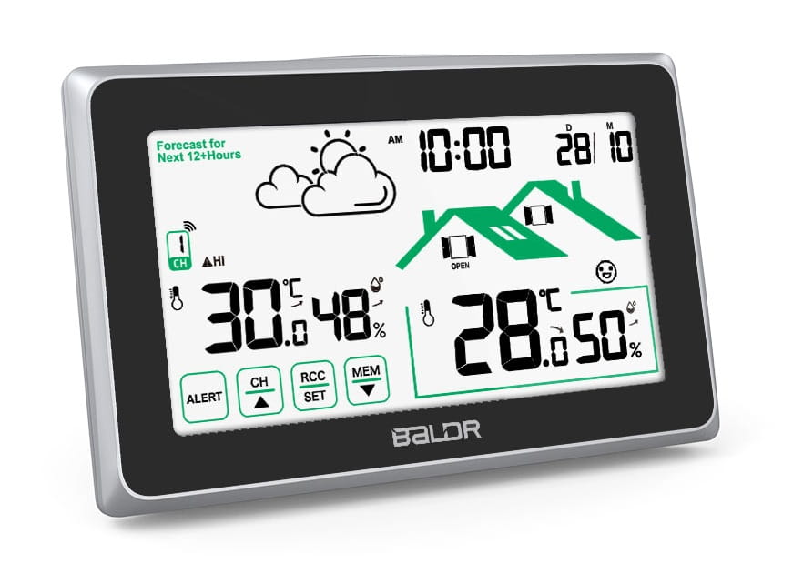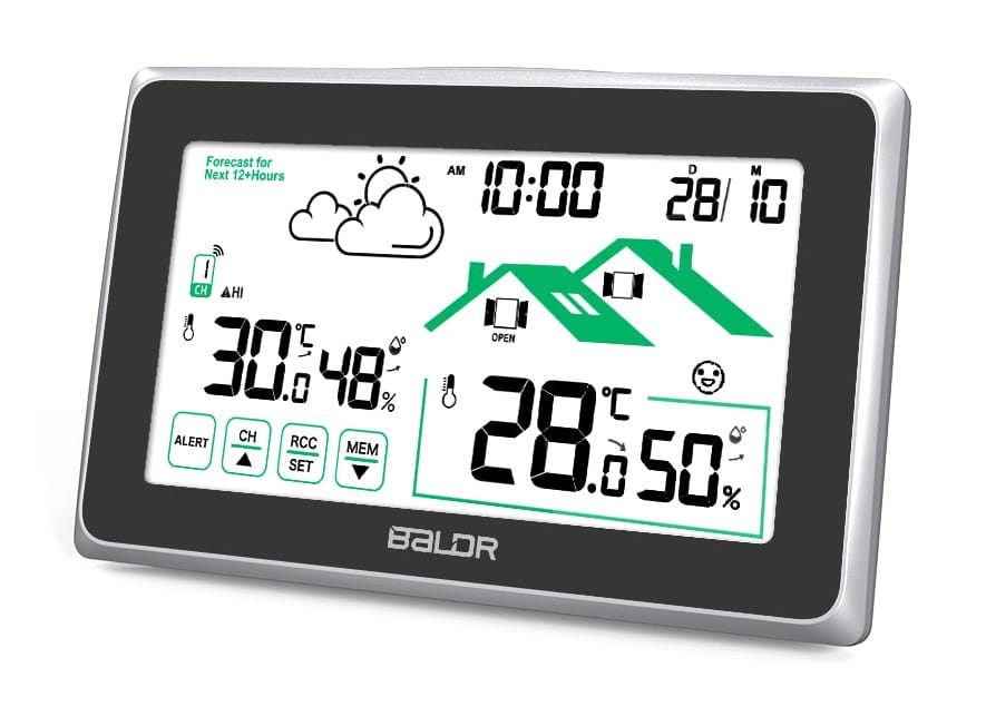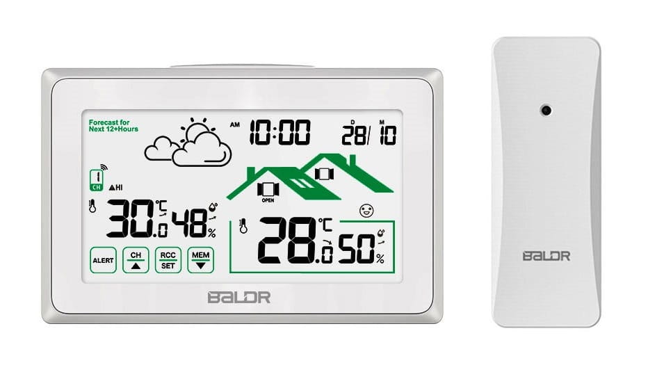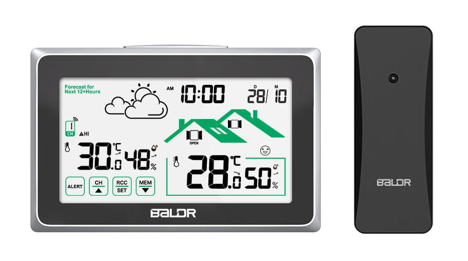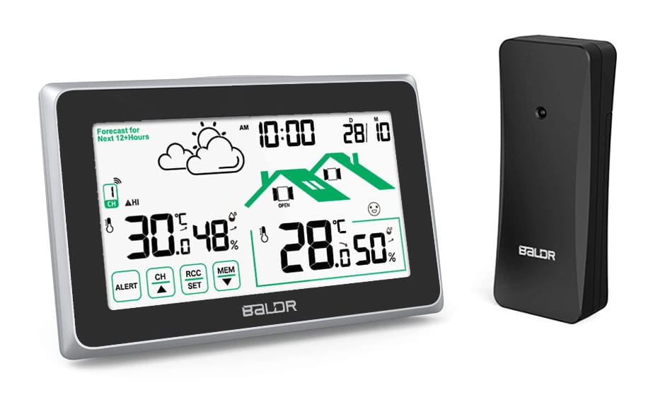 Bezprzewodowa stacja pogodowa Baldr B340-V8 z funkcją ekranu dotykowego: mierzy temperaturę wewnętrzną i zewnętrzną oraz przewiduje lokalną prognozę pogody, co czyni go idealnym wyborem do uzyskiwania dokładnych pomiarów dostępnych za jednym spojrzeniem na dużym czytelnym wyświetlaczu.