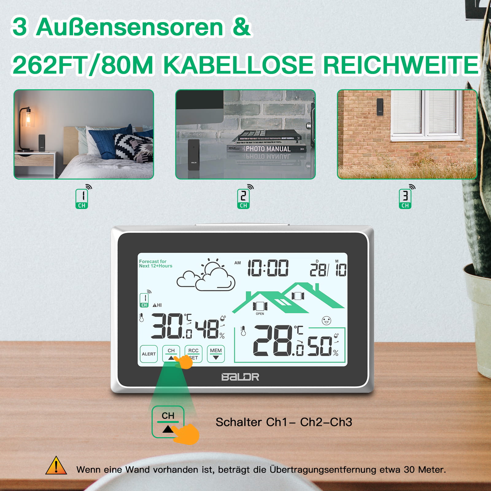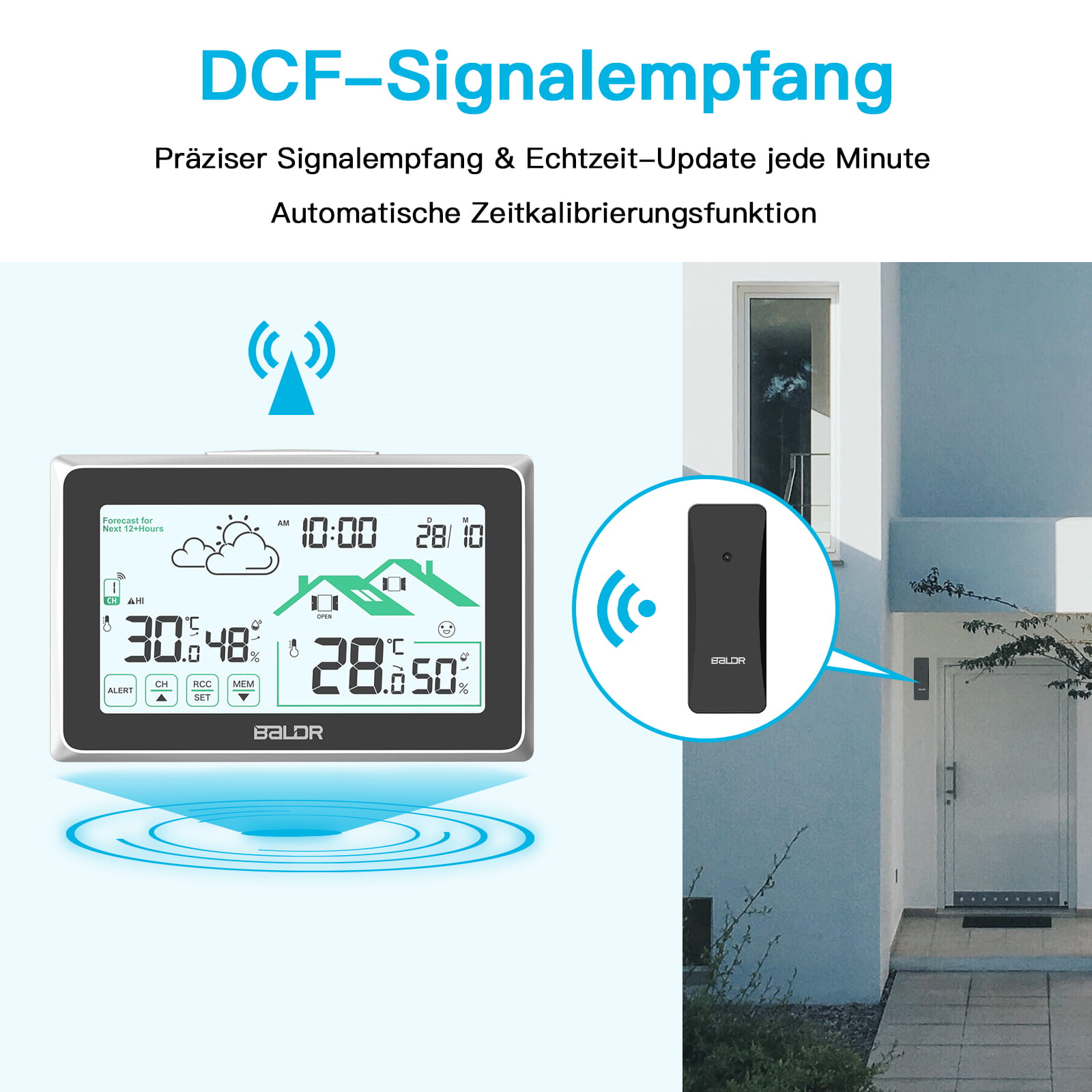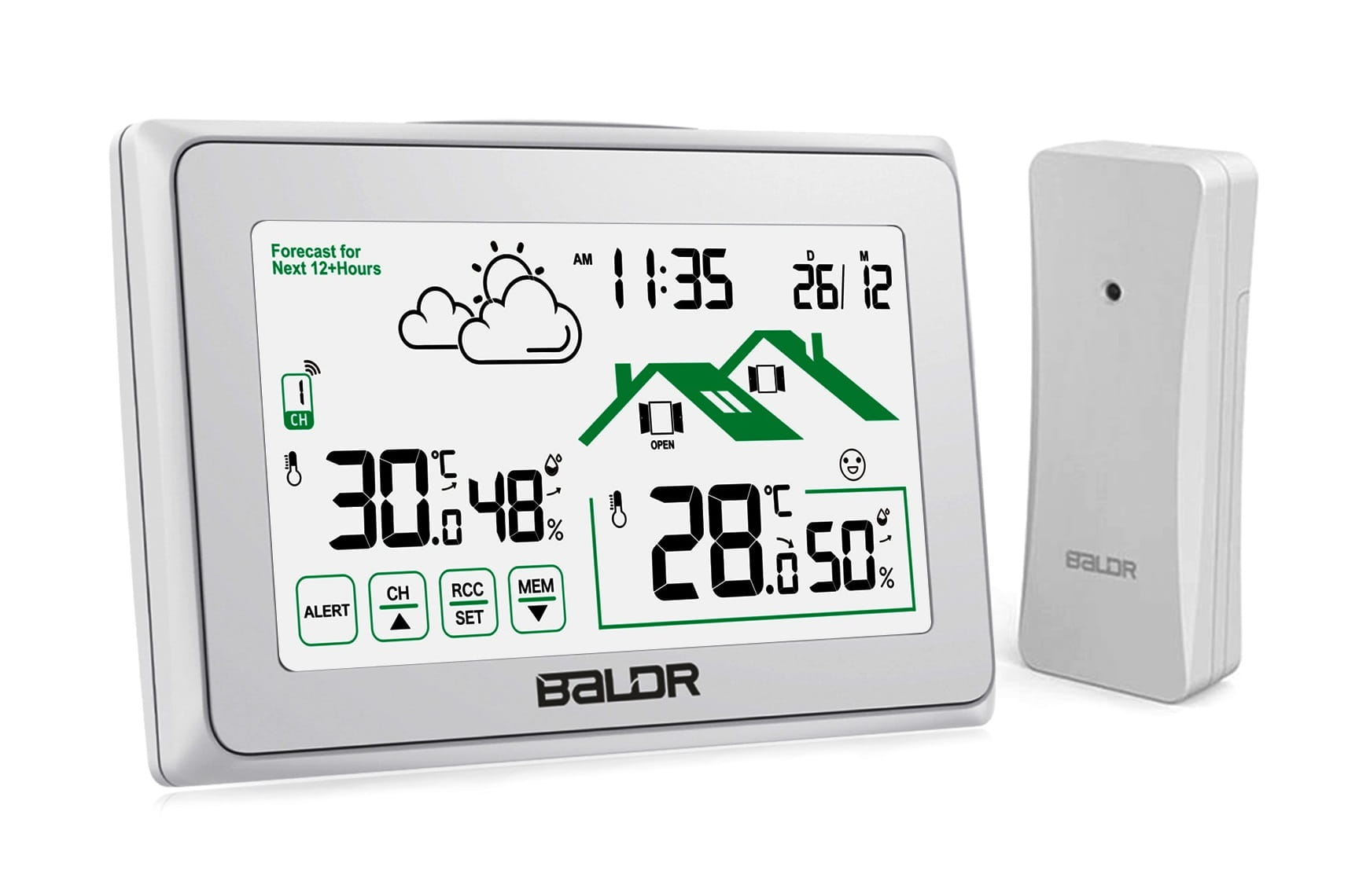Bezprzewodowa stacja pogodowa Baldr B340-V8 z funkcją ekranu dotykowego: mierzy temperaturę wewnętrzną i zewnętrzną oraz przewiduje lokalną prognozę pogody, co czyni go idealnym wyborem do uzyskiwania dokładnych pomiarów dostępnych za jednym spojrzeniem na dużym czytelnym wyświetlaczu.