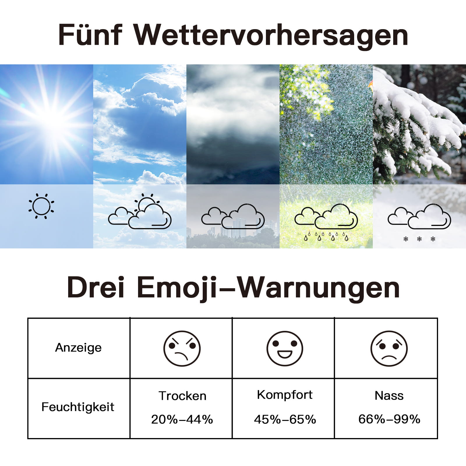Duży bezprzewodowy termometr wewnętrzny z czujnikiem zewnętrznym wyświetla prognozę pogody, która jest w stanie przewidzieć warunki pogodowe za pomocą ciśnienia barometrycznego z 12-24 godzinnym wyprzedzeniem, a następnie wyświetlić prognozę pogody za pomocą 5 ikon (słonecznie, częściowo pochmurno, pochmurno, deszcz i śnieg).