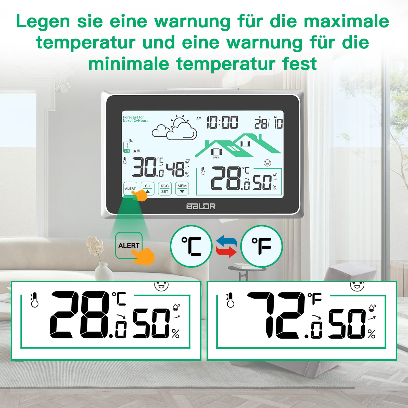 Wewnętrzna stacja pogody Baldr B340-V8 cechuje się dużym, wyraźnym wyświetlaczem LCD z dużymi cyframi. Wyświetlacz pokazuje aktualne pomiary temperatury i wilgotności wewnątrz i na zewnątrz, a także strzałki trendu wskazujące, czy temperatura lub wilgotność rosną, spadają, czy pozostają na tym samym poziomie. Rejestruje maksymalną/minimalną temperaturę i wilgotność wewnątrz i na zewnątrz, które aktualizowane są co 24 godziny o godzinie 0:00. Wyświetlanie temperatury jednostki wewnętrznej waha się od -10°C do 50°C z odchyleniem ±1°C, a zewnętrznej -40°C do 60°C. Wilgotność jest wyświetlana w zakresie od 1 do 99% RH (±5%). Odczyty aktualizują się automatycznie co 30 sekund dzięki wbudowanym czułym czujnikom. Temperatura powietrza może być wyświetlana w °C lub °F.
