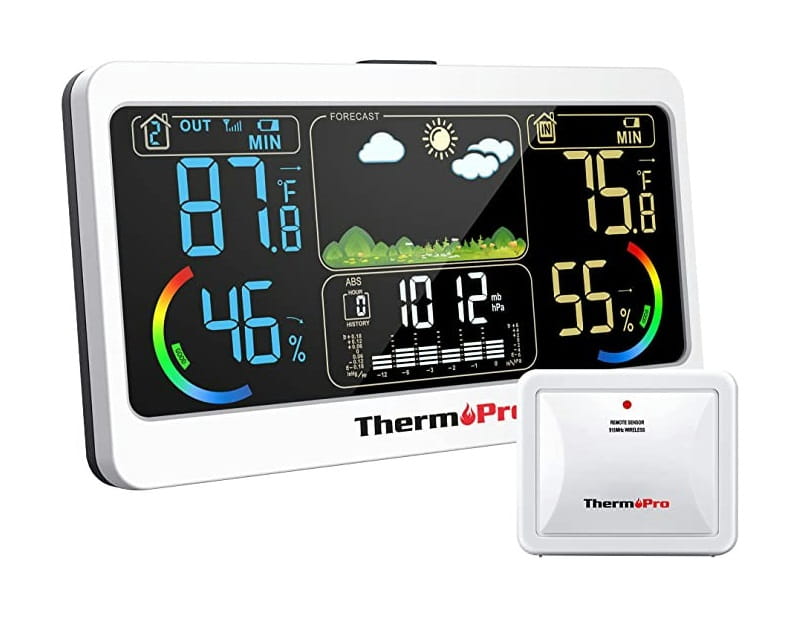 Bezprzewodowa stacja pogodowa ThermoPro TP-68 z barometrem: mierzy temperaturę wewnętrzną i zewnętrzną oraz przewiduje lokalną prognozę pogody, co czyni go idealnym wyborem do uzyskiwania dokładnych pomiarów dostępnych za jednym spojrzeniem na dużym czytelnym wyświetlaczu.
