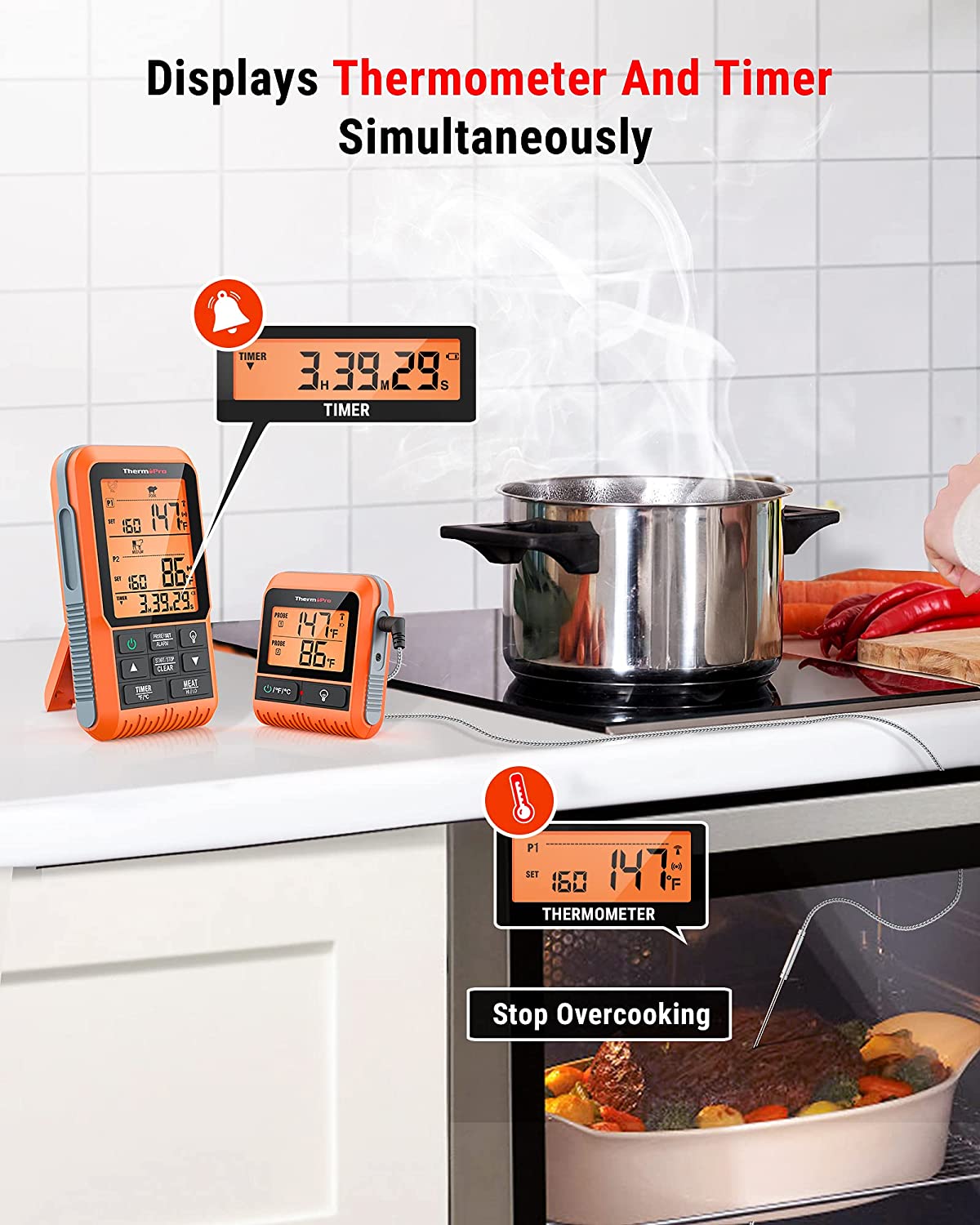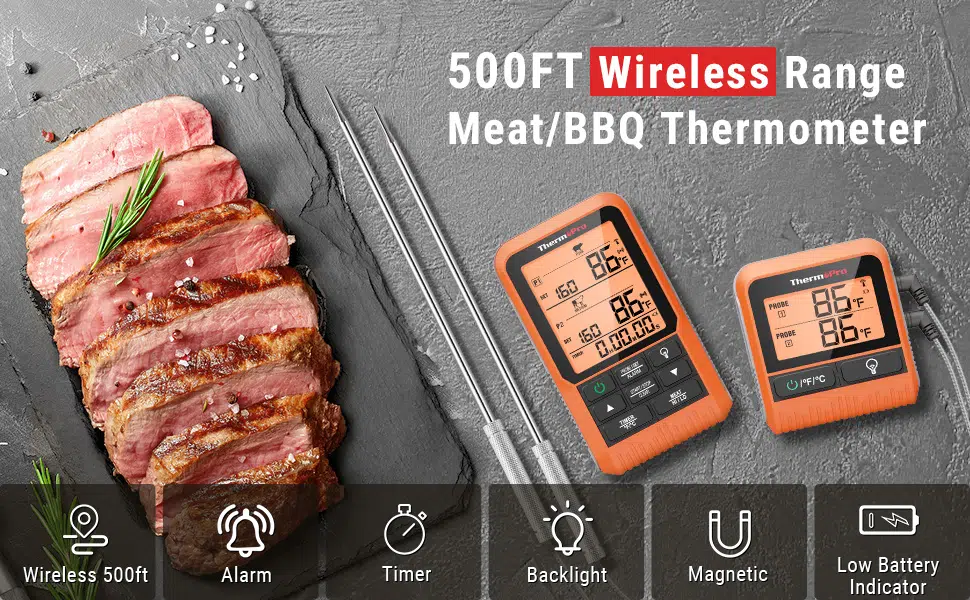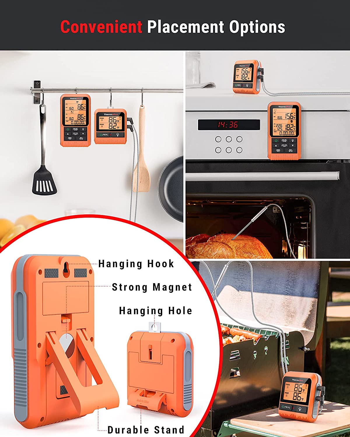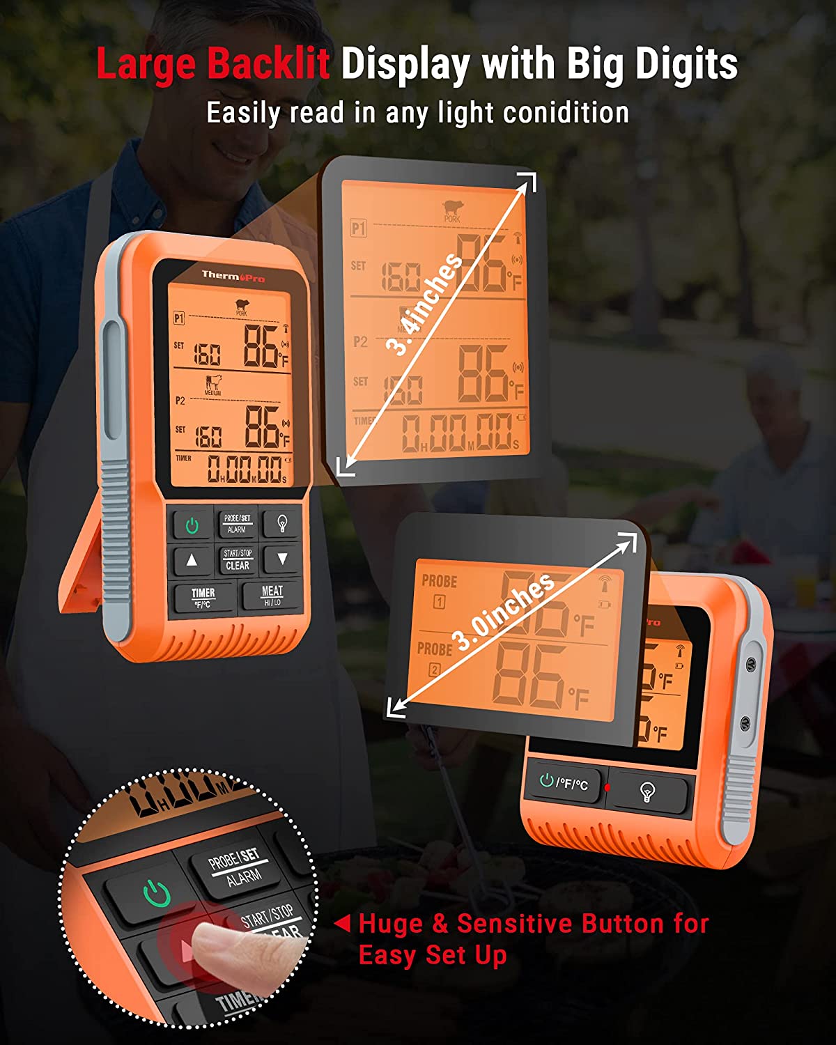 Wysokiej jakości bezprzewodowy termometr do żywności ThermoPro TP-826 z 2 sondami pozwoli Ci na łatwe i przyjemne przygotowanie potraw według Twoich preferencji. Dzięki urządzeniu możesz monitorować temperaturę np. mięsa podczas wędzenia bez konieczności stałego sprawdzania. Wygodnie sprawdzisz to zdalnie siedząc np. w salonie czy na tarasie, na co pozwala zasięg do 150m.