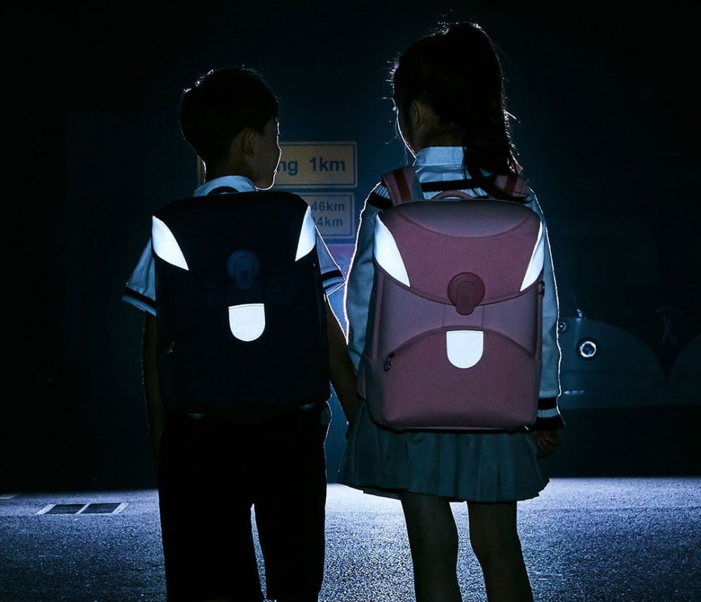 Wkładki z tkaniny odblaskowej 3M zapewniające bezpieczeństwo są umieszczone po różnych stronach plecaka . Późnym wieczorem lub wczesnym rankiem takie wkładki zapewnią niezbędną widoczność i bezpieczeństwo na drodze.
